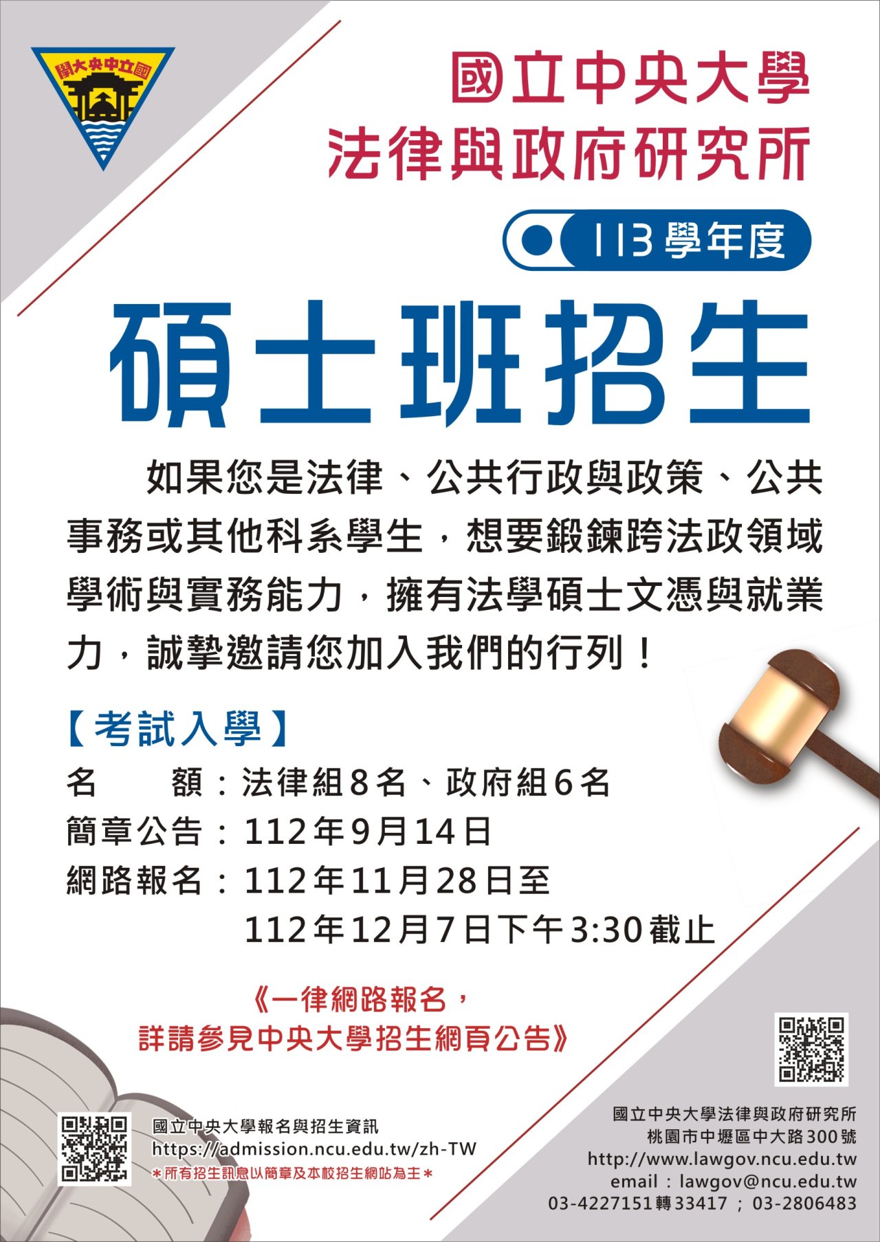 一、 | 「法律與政府研究所碩士班」113學年度招生報名日期自112年11月28日上午9點起至112年12月7日下午3點30分止。 |