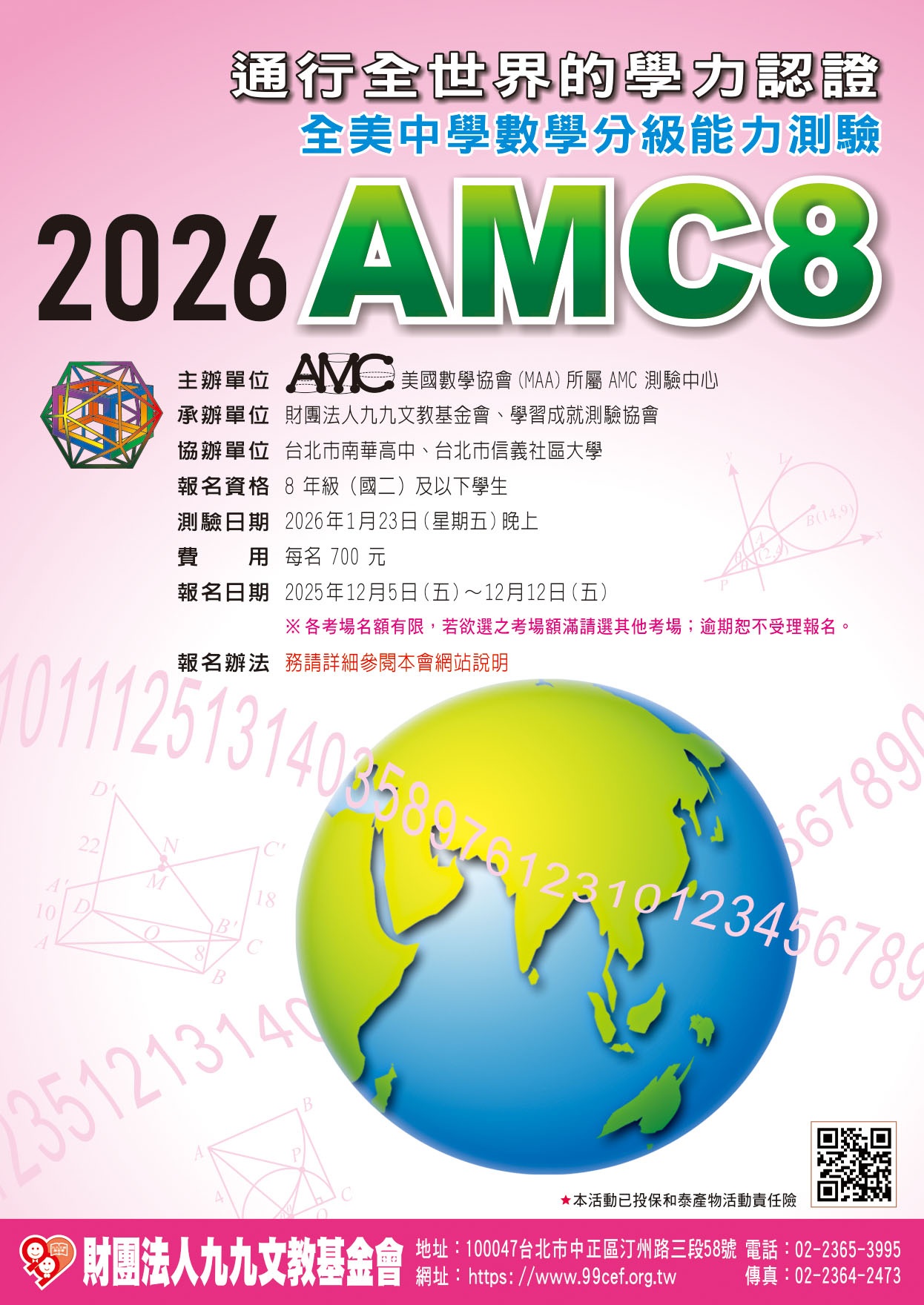 財團法人九九文教基金承辦美國數學協會(MAA)所屬AMC測驗中心「2026年全美中學數學分級能力測驗AMC8」台灣區測驗報名訊息