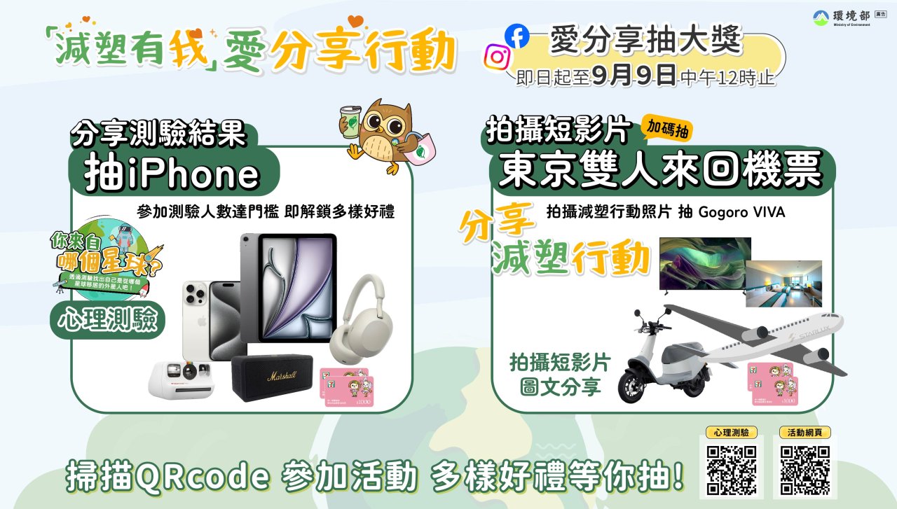 二、 環境部為鼓勵社會大眾及莘莘學子在暑期假期間一起跟上全球減少塑膠的風潮,特辦理「減塑有我」愛分享行動,可透過臉書(Facebook)、Instagram(IG)等社群媒體,拍攝個人生活中減塑短影片、減塑生活照片,並可透過參加 「你來自哪個星球?」心理測驗遊戲,瞭解並發覺屬於自己獨特的環保行動,歡迎民眾邀請親朋好友一起在生活中響應減塑行動,參加旨揭活動拿大獎。