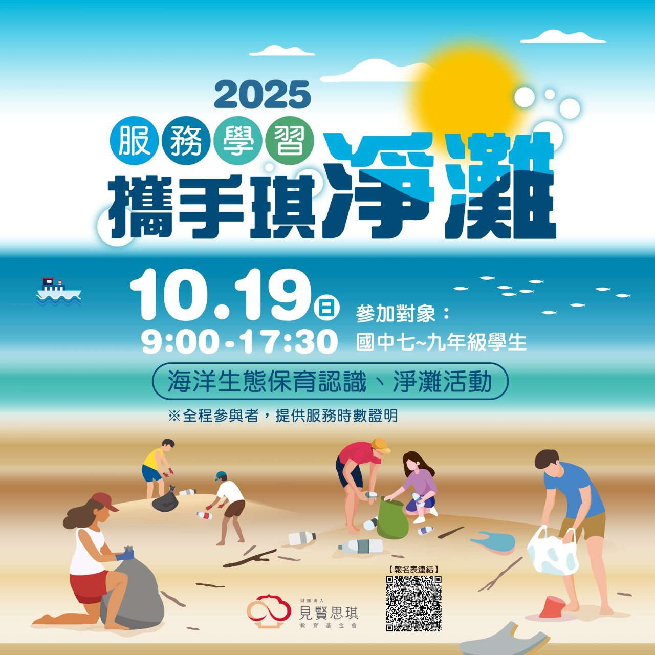 一、 本會辦理「2025服務學習-攜手琪淨灘」服務學習活動,透過做中學提供社會參與機會,增進青少年對公共議題的關心,豐富其學習視野,歡迎青少年踴躍參與。